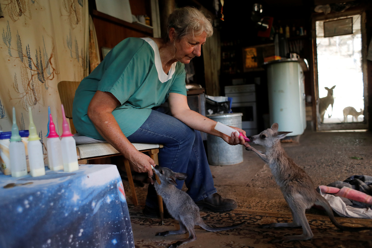 Julie Willis, an animal carer, feeds orphaned kangaroo joeys that were rescued during the bushfire season, in the living room of her home in the community of Wytaliba, New South Wales, Australia January 27, 2020. REUTERS/Jorge Silva