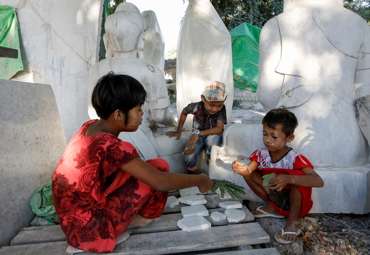 Children play with pieces of marble at a marble carving workshop in Sagyin, Mandalay, Myanmar, October 19, 2019. REUTERS/Ann Wang