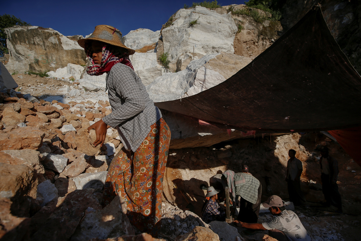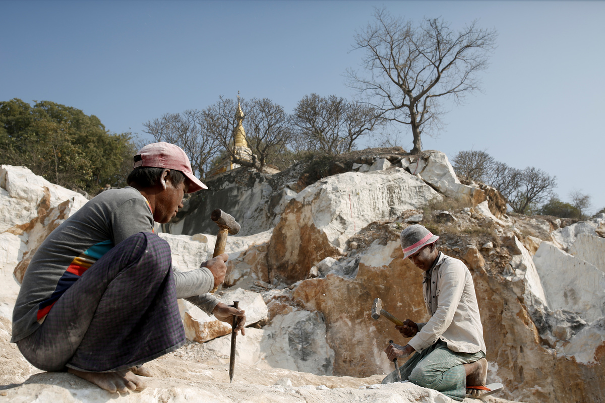 Marble carvers who work for Kyi Khaing, carve statues at a workshop in Sagyin, Mandalay, Myanmar, February 15, 2019. REUTERS/Ann WangA marble carver makes measurements of a piece of marble as he carves a Buddhist statue at a marble carving workshop in Sagyin, Mandalay, Myanmar, February 14, 2019. REUTERS/Ann WangMarble statues that were made in Sagyin, are displayed for sale in a shop at the village, Mandalay, Myanmar, February 16, 2019. REUTERS/Ann Wang A group of people walk past an unfinished marble statue of a Buddha in Sagyin, Mandalay, Myanmar, February 14, 2019. REUTERS/Ann Wang Marble carvers carve statues at a workshop in Sagyin, Mandalay, Myanmar, February 15, 2019. REUTERS/Ann Wang A marble carver carves a statue at his workshop in Sagyin, Mandalay, Myanmar, February 13, 2019. REUTERS/Ann WangWomen who work at a marble workshop, polish marble statues in Sagyin, Mandalay, Myanmar, October 19, 2019. REUTERS/Ann Wang A woman who works at a marble mine poses for a photograph at a marble site in Sagyin, Mandalay, Myanmar, February 15, 2019. REUTERS/Ann Wang A worker leans on a marble statue of a Buddha as he rests at a marble site where he works, in Sagyin, Mandalay, Myanmar, February 15, 2019. REUTERS/Ann Wang A marble statue of a Buddha is left near the Irrawaddy River to be transported to a buyer in Sagyin, Mandalay, Myanmar, October 19, 2019. REUTERS/Ann Wang A woman who works at a marble mine is driven home after finishing work for the day at a marble mine site in Sagyin, Mandalay, Myanmar, February 15, 2019. REUTERS/Ann WangA man sits on a piece of marble as he bathes near a marble site in Sagyin, Mandalay, Myanmar, February 14, 2019. REUTERS/Ann Wang Mya Lay (R), 25, and her colleagues, who used to work at a marble mine but lost their jobs, pick leftover peanuts at a farm where they now work in Sagyin, Mandalay, Myanmar, February 15, 2019. "I was born in this village and for generations this is what we have done: the men work on marble carving and the women work in the marble mines or polish the marble statues," said Lay. REUTERS/Ann WangKyawt Kyawt Lwin, 7, whose mother Mya Lay used to work at a marble mine but lost her job, reads her homework book at their home in Sagyin, Mandalay, Myanmar, February 14, 2019. REUTERS/Ann WangA woman, whose daughter Mya Lay used to work at a marble mine but lost her job, sits by an open fire with other family members at their home in Sagyin, Mandalay, Myanmar, February 14, 2019. REUTERS/Ann Wang Workers at a marble site move pieces of extracted marble from a marble mine in Sagyin, Mandalay, Myanmar, February 15, 2019. REUTERS/Ann Wang A worker polishes a Buddhist statue made of marble at a workshop in Sagyin, Mandalay, Myanmar, October 11, 2019. REUTERS/Ann Wang Workers at a marble site move extracted marble stones from a marble mine in Sagyin, Mandalay, Myanmar, October 18, 2019. REUTERS/Ann WangPieces of marble are sequenced with number markings to be used to build a large statue of a Buddha, on a roadside in Sagyin, Mandalay, Myanmar, October 18, 2019. REUTERS/Ann Wang