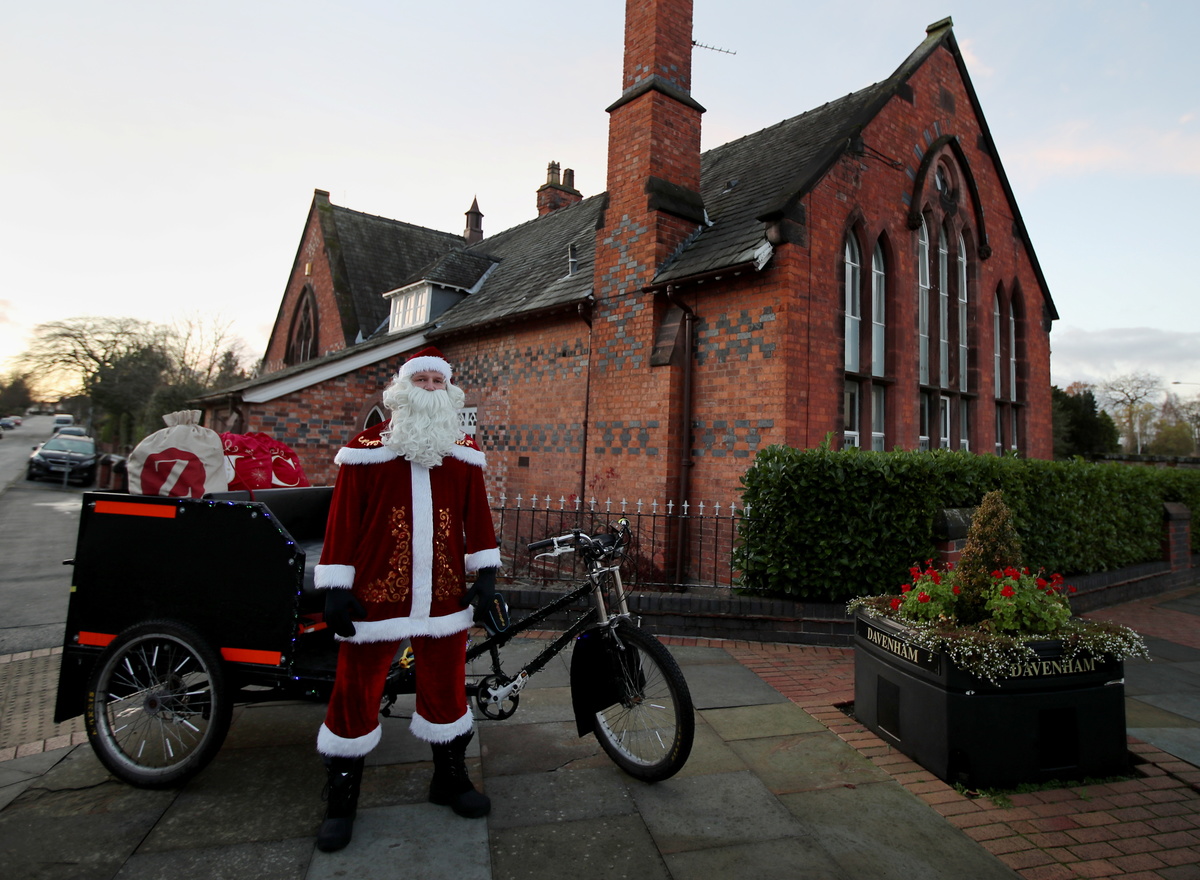 Paul Dean, 35, a personal trainer from Northwich, poses for a photograph dressed as Santa Claus with his bike that he uses to deliver Christmas presents to local villages in Davenham, Britain, November 25, 2020. REUTERS/Molly Darlington