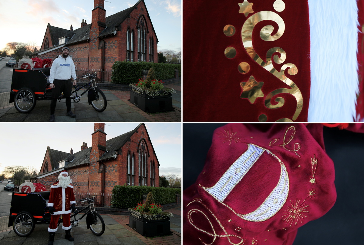 A combination picture shows Paul Dean, 35, a personal trainer from Northwich in his everyday clothing and dressed as Santa Claus, posing for photographs in front of his bike he uses to deliver Christmas presents to local villages, and a Christmas gift that he will be delivering, in Davenham, Britain, November 25, 2020. "There's no one on my naughty list this year, it's been a terribly hard year for many people, so to get everyone in the Christmas spirit they have all made it onto my nice list!" said Dean. "I especially hope to bring joy to all the key workers who have been working throughout this difficult time, they deserve to have an extra special Christmas." REUTERS/Molly Darlington