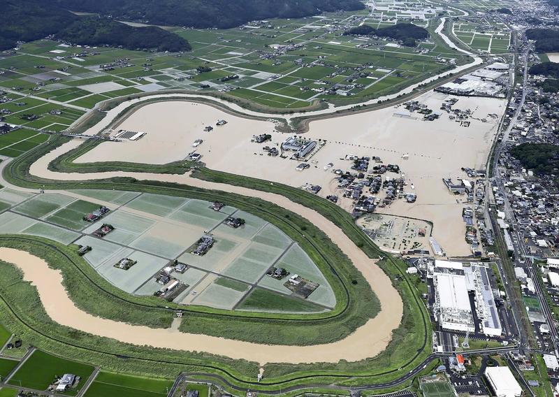 Residential areas and farmland are seen flooded Thursday in Omachi, Saga Prefecture. Due to heavy rain lashing the northern Kyushu region since Monday, the town has suffered widespread flood damage and is still partly inundated. Staff and patients at Juntendo Hospital were rescued by boat, along with residents who had evacuated there. An estimated 50,000 liters of oil has also flowed out from an iron factory about one kilometer west of the hospital. The municipal government, the Maritime Self-Defense Force and other organizations are working to retrieve the oil.