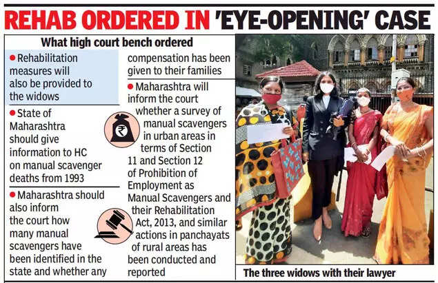 MUMBAI: In a relief for three widows of manual scavengers who died in December 2019, Bombay high court on Friday directed the district collector to pay Rs 10 lakh compensation to each within four weeks after terming the case as “eye-opening”.