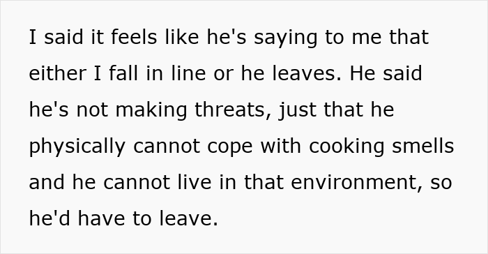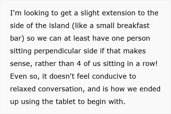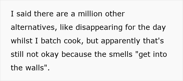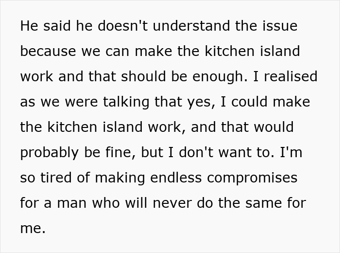 She is still willing to compromise on adding an extension to the kitchen island and even try to batch cook when he isn’t home
