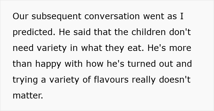 The husband argues that things are just fine the way they are and also feels kids don’t need to expand their pallets at their age