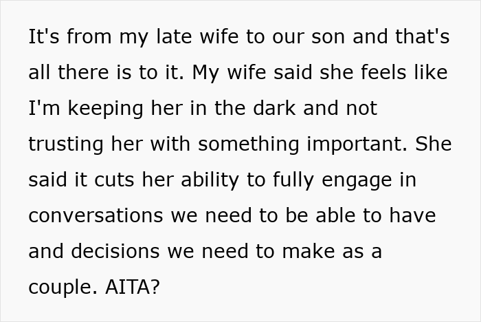 Entering into a marriage with a widowed person comes with many challenges. The biggest one could be that the deceased spouse might never really go away. That’s especially true when there are children in the picture. The stepson and the dad might perceive what the stepmom in this story is doing as disrespectful to the memory of the mother.