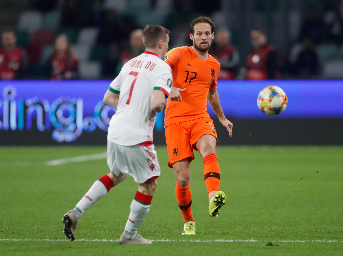 Soccer Football - Euro 2020 Qualifier - Group C - Belarus v Netherlands - Dinamo Stadion, Minsk, Belarus - October 13, 2019 Belarus's Oleg Veretilo in action with Netherlands' Daley Blind REUTERS/Vasily Fedosenko