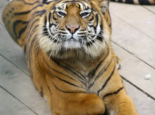 Lone hunters, such as male tigers, use their paws in a similar way to lions during a hunt but do not normally rely on other tigers’ help. Incredibly though, a healthy looking male tiger was caught on camera in 2007 with the lower part of his right leg missing in Tesso Nilo National Park, Sumatra. Like all big cats, tigers eat a wide variety of prey from birds to large deer. The injured male may have focused on hunting small prey, which tigers can kill with a bite to the back of the neck. The injured tiger may have also turned to easier sources of food than wild prey such as livestock.