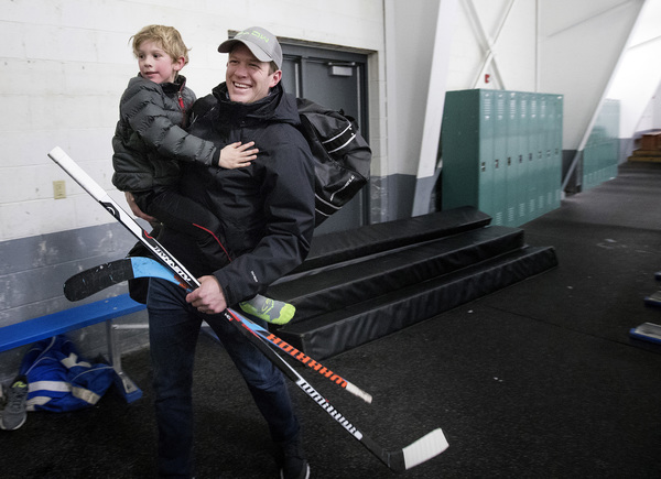Several times a week, Brooks skates with his friend, Zach, the oldest child of dad's defense partner, Jared Spurgeon. Often after Wild games, Brooks, wearing a No. 20 Suter jersey, and Zach, wearing a No. 46 Spurgeon jersey, organize knee hockey games with other players' children on the carpet.