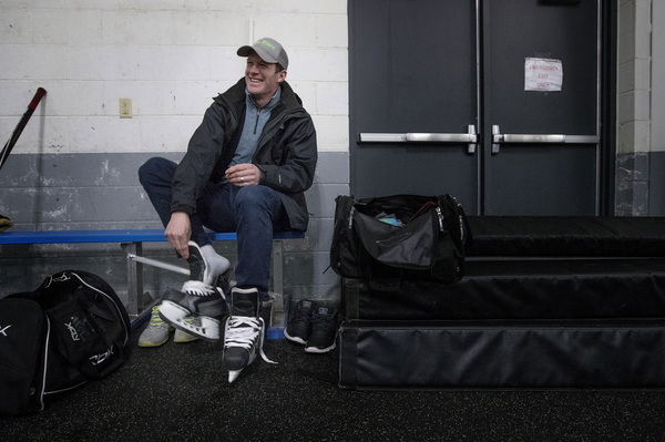 Nightly during intermissions, in a suite high above Xcel Energy Center's ice, Brooks plays mini sticks with Eric Staal's and Jason Pominville's kids.