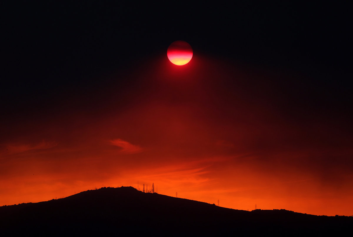 The sun sets under a cloud of smoke caused by a wildfire fanned by strong winds on the island of Evia, in Athens, Greece, August 12, 2018. REUTERS/Yannis Behrakis