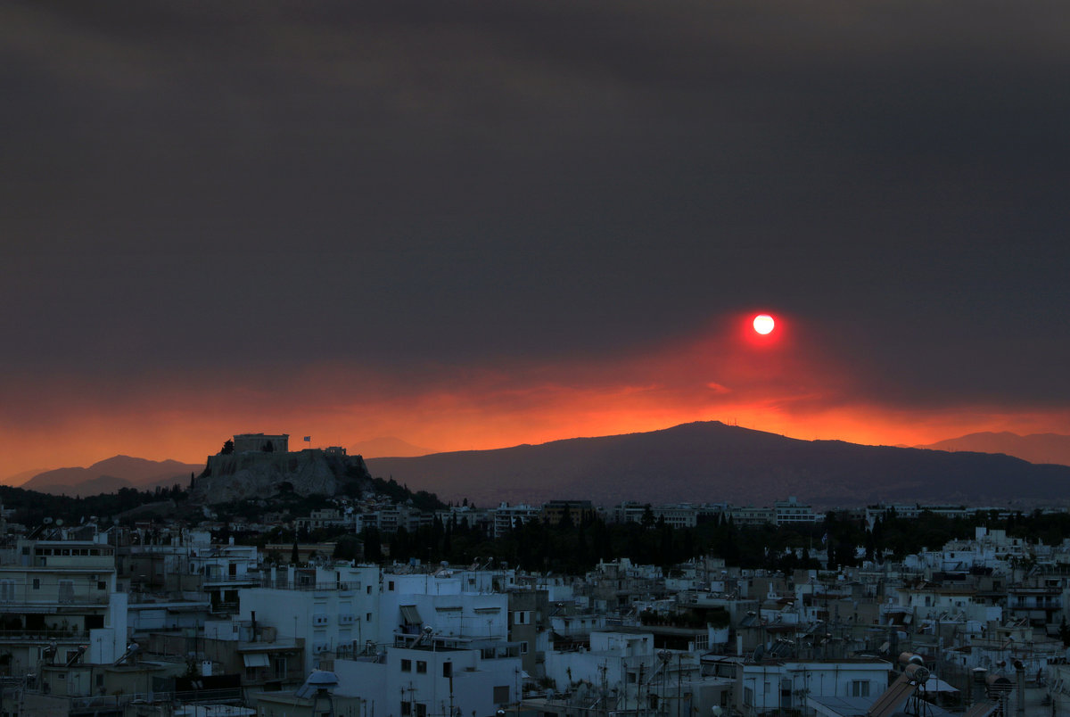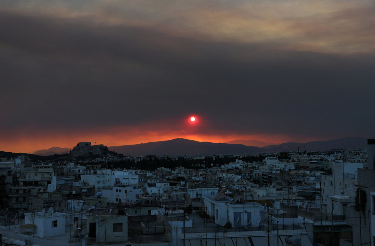 The sun sets over Athens and its ancient Acropolis (L) as a thick cloud of smoke levitates over the Greek capital, caused by a forest fire, fanned by strong winds on the island of Evia, in Athens, Greece, August 12, 2018. REUTERS/Yannis Behrakis