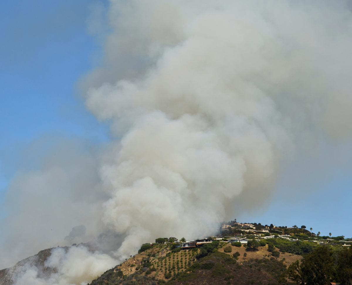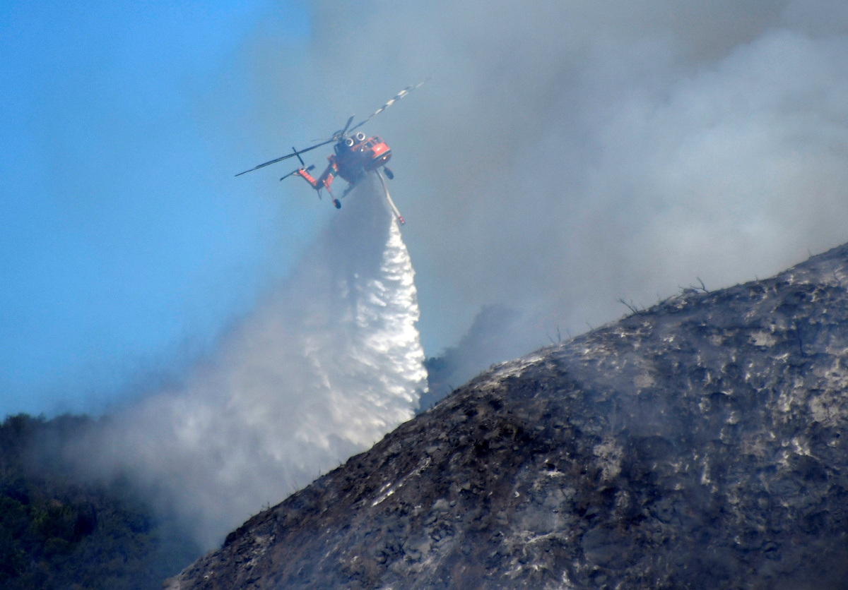 LOS ANGELES (Reuters) - A wildfire raced up a steep hillside to threaten scores of homes in the Los Angeles coastal enclave of Pacific Palisades on Monday, prompting evacuations as water-dropping helicopters and firefighters swarmed the area to battle the flames.
