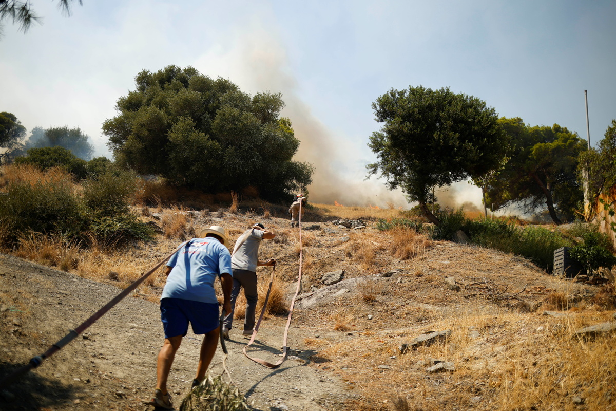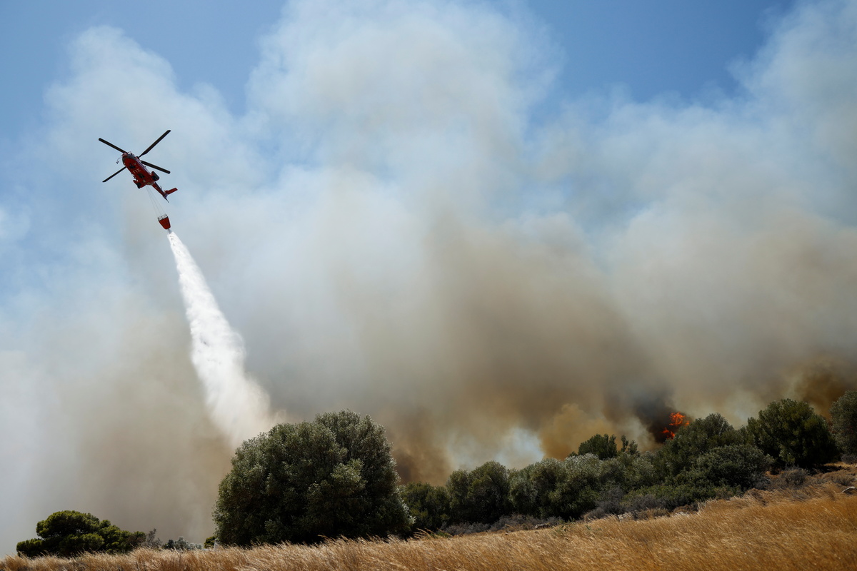 On Monday, a blaze broke out on a mountain near the port town of Lavrio, about 60 km (40 miles) south of Athens, sending thick plumes of smoke above a busy beach, where windsurfers were riding the waves.