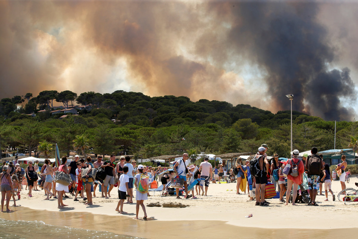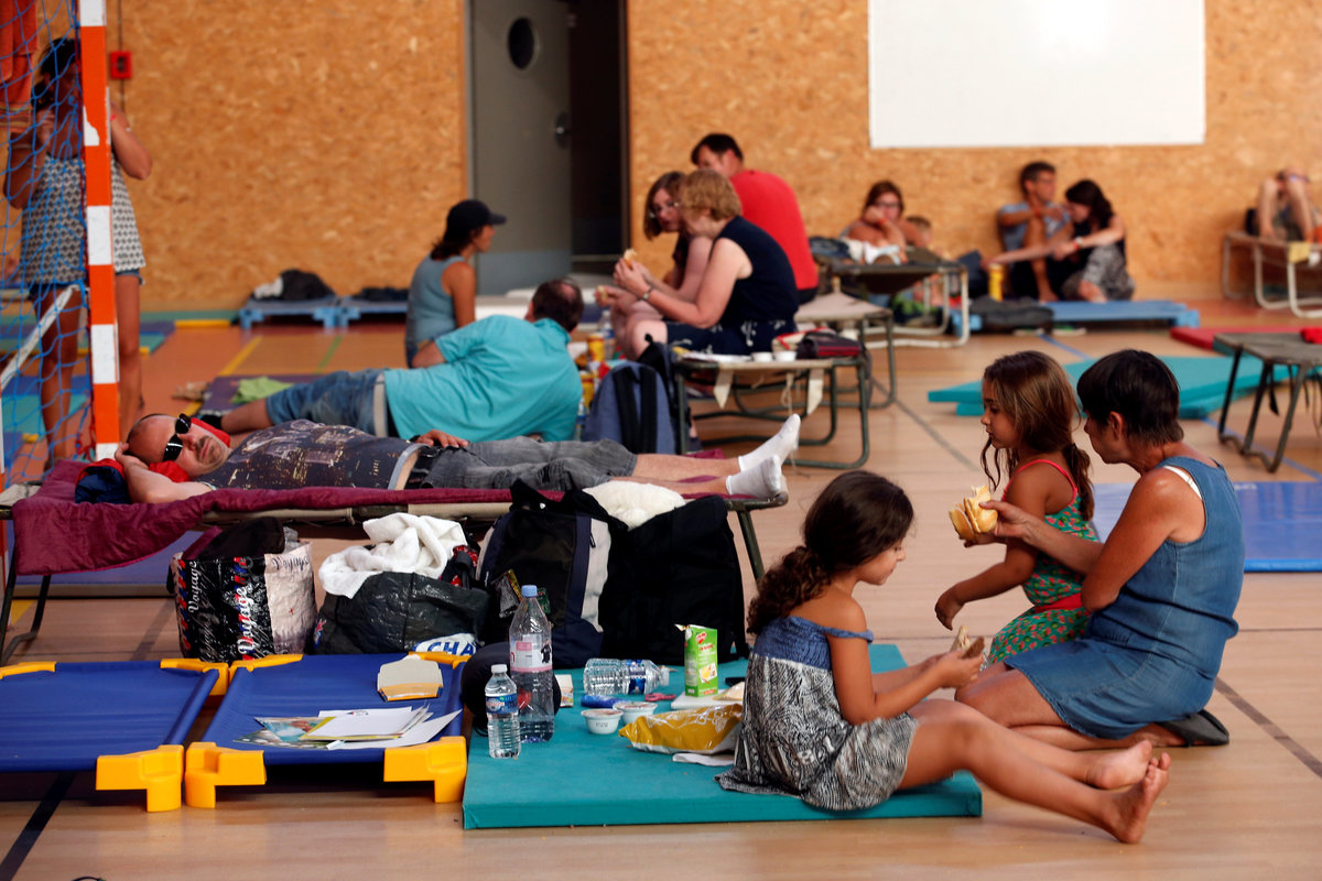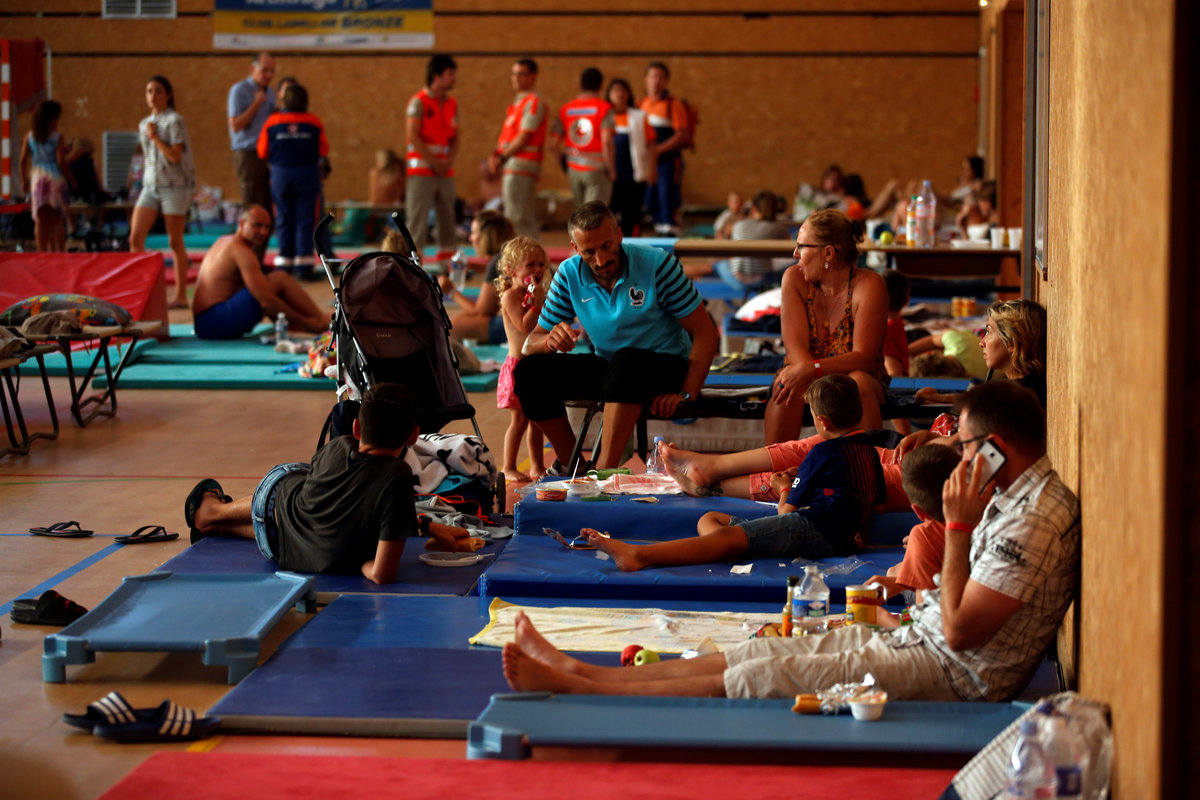 Tourists, who were evacuated due to a forest fire, rest on mats and cots and eat a meal in a gymnasium in Bormes-les-Mimosas, in the Var department, France, July 26, 2017. REUTERS/Jean-Paul PelissierFlames and smoke fill the sky above a burning hillside as tourists swim on the beach in Bormes-les-Mimosas, in the Var department, France, July 26, 2017. REUTERS/Jean-Paul PelissierA Canadair firefighting aircraft drops water on a wildfire which burns a forest in Carros, near Nice, France. REUTERS/Eric GaillardA woman and her daughter look at a plume of smoke from burning fires that fills the sky in Bormes-les-Mimosas, in the Var department, France, July 26, 2017. REUTERS/Jean-Paul PelissierSmoke fills the sky above a burning hillside as tourists swim in the waters off the beach in Bormes-les-Mimosas, in the Var department, France, July 26, 2017. REUTERS/Jean-Paul PelissierThe charred debris of vehicles and a building that were destroyed by fire are seen near a parking lot for camping cars in Bormes-les-Mimosas, in the Var department, France, July 26, 2017, after firefighters evacuated thousands of campers and local residents when a wildfire broke out on France's tourist-thronged Riviera coast overnight. REUTERS/Jean-Paul PelissierPeople stand near charred debris of vehicles that were destroyed by fire in a parking lot for camping cars in Bormes-les-Mimosas, in the Var department, France, July 26, 2017, after firefighters evacuated thousands of campers and local residents when a wildfire broke out on France's tourist-thronged Riviera coast overnight. REUTERS/Jean-Paul PelissierPeople walk past charred debris of vehicles that were destroyed by fire in a parking lot for camping cars in Bormes-les-Mimosas, in the Var department, France, July 26, 2017, after firefighters evacuated thousands of campers and local residents when a wildfire broke out on France's tourist-thronged Riviera coast overnight. REUTERS/Jean-Paul PelissierTourists look smoke that rises from trees at a forest fire on La Croix-Valmer from Cavalaire-sur-Mer, near Saint-Tropez, France. REUTERS/Jean-Paul PelissierSmoke fills the sky as flames from a wildfire burn trees near Seillons, in the Var department, France, July 25, 2017. REUTERS/Jean-Paul PelissierVehicles that were destroyed by a burning wildfire are seen near a damaged home in Carros, near Nice, France. REUTERS/Eric GaillardA man waters the roof of his house with a garden hose as a smoke from a burning wildfire fills the sky in Carros, near Nice, France. REUTERS/Eric GaillardTourists evacuate the beach as smoke fills the sky above a burning hillside in Bormes-les-Mimosas, in the Var department, France, July 26, 2017. REUTERS/Jean-Paul Pelissier
