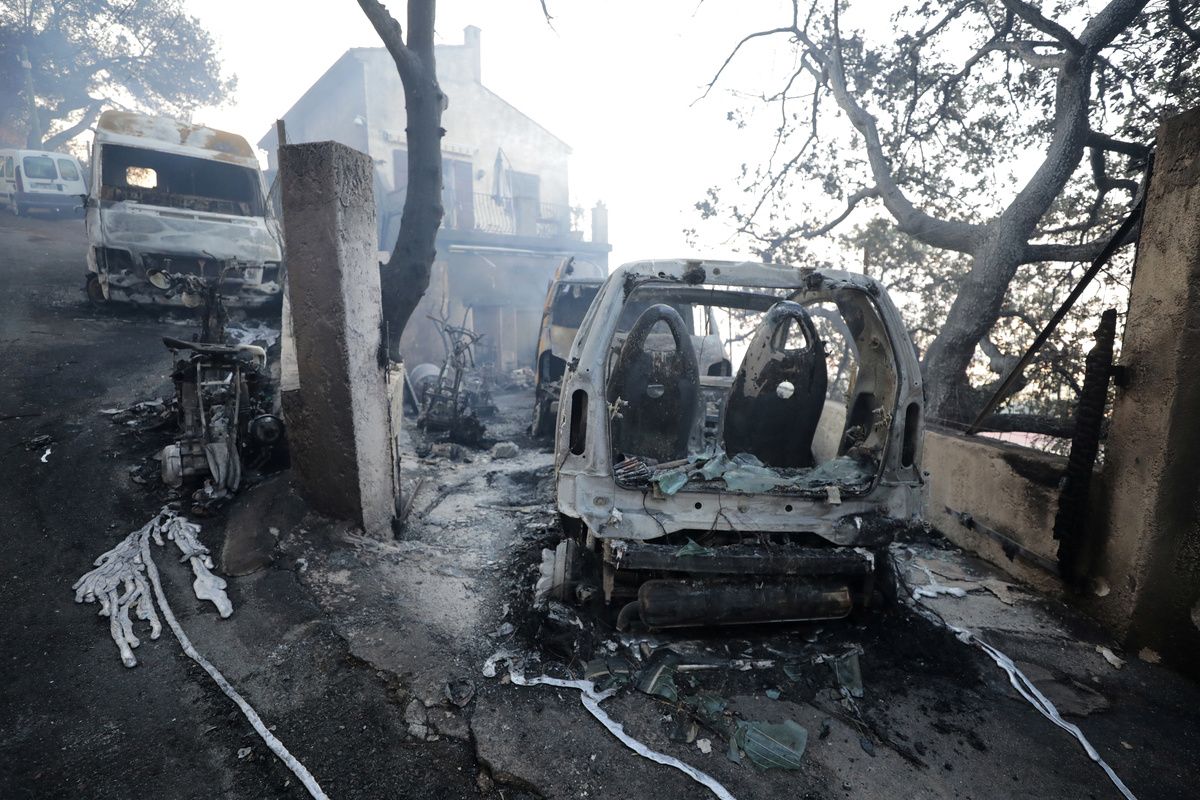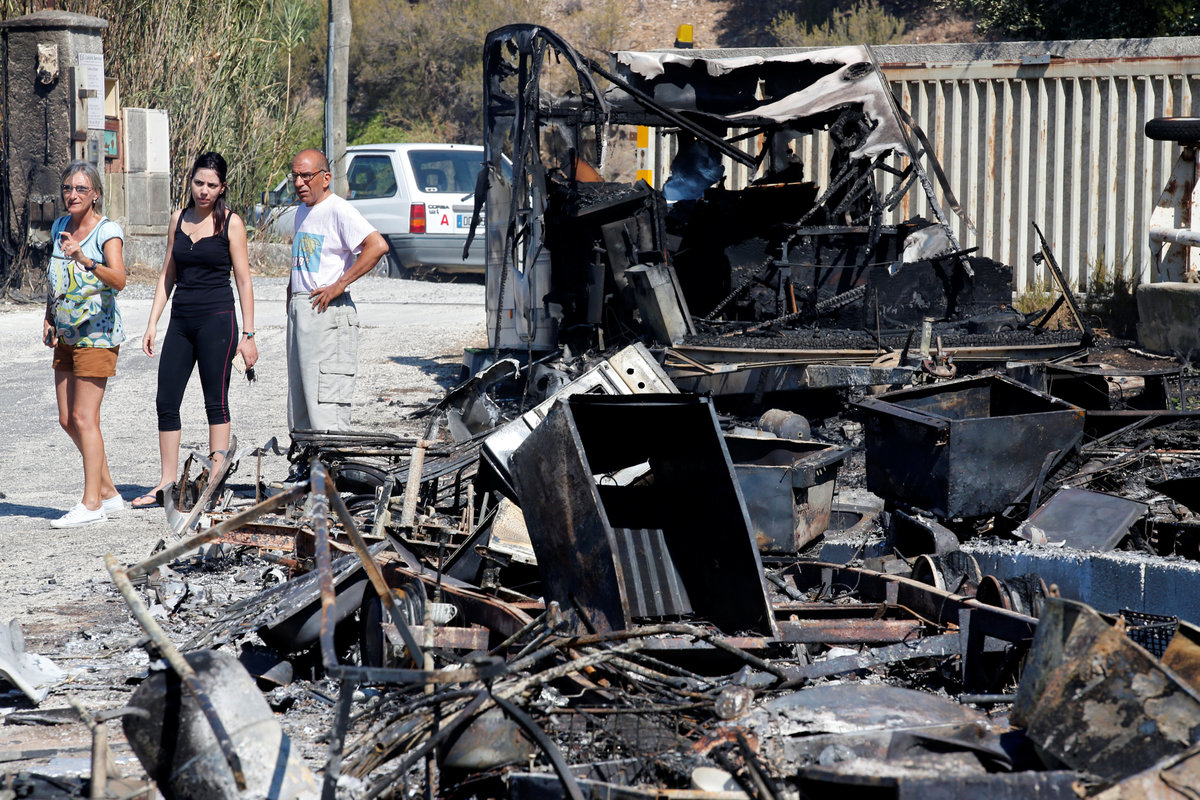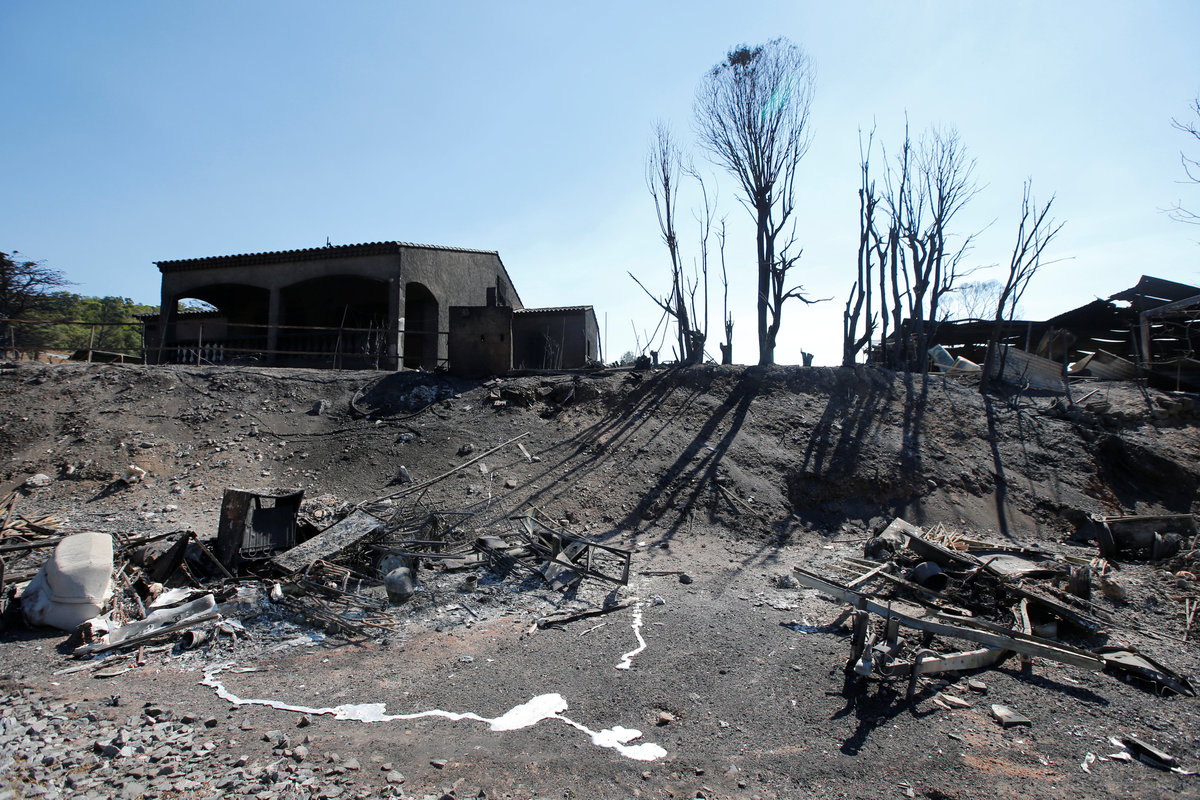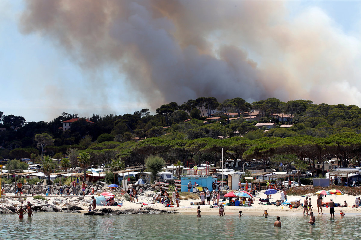 Tourists, who were evacuated due to a forest fire, rest on mats and cots and eat a meal in a gymnasium in Bormes-les-Mimosas, in the Var department, France, July 26, 2017. REUTERS/Jean-Paul PelissierFlames and smoke fill the sky above a burning hillside as tourists swim on the beach in Bormes-les-Mimosas, in the Var department, France, July 26, 2017. REUTERS/Jean-Paul PelissierA Canadair firefighting aircraft drops water on a wildfire which burns a forest in Carros, near Nice, France. REUTERS/Eric GaillardA woman and her daughter look at a plume of smoke from burning fires that fills the sky in Bormes-les-Mimosas, in the Var department, France, July 26, 2017. REUTERS/Jean-Paul PelissierSmoke fills the sky above a burning hillside as tourists swim in the waters off the beach in Bormes-les-Mimosas, in the Var department, France, July 26, 2017. REUTERS/Jean-Paul PelissierThe charred debris of vehicles and a building that were destroyed by fire are seen near a parking lot for camping cars in Bormes-les-Mimosas, in the Var department, France, July 26, 2017, after firefighters evacuated thousands of campers and local residents when a wildfire broke out on France's tourist-thronged Riviera coast overnight. REUTERS/Jean-Paul PelissierPeople stand near charred debris of vehicles that were destroyed by fire in a parking lot for camping cars in Bormes-les-Mimosas, in the Var department, France, July 26, 2017, after firefighters evacuated thousands of campers and local residents when a wildfire broke out on France's tourist-thronged Riviera coast overnight. REUTERS/Jean-Paul PelissierPeople walk past charred debris of vehicles that were destroyed by fire in a parking lot for camping cars in Bormes-les-Mimosas, in the Var department, France, July 26, 2017, after firefighters evacuated thousands of campers and local residents when a wildfire broke out on France's tourist-thronged Riviera coast overnight. REUTERS/Jean-Paul PelissierTourists look smoke that rises from trees at a forest fire on La Croix-Valmer from Cavalaire-sur-Mer, near Saint-Tropez, France. REUTERS/Jean-Paul PelissierSmoke fills the sky as flames from a wildfire burn trees near Seillons, in the Var department, France, July 25, 2017. REUTERS/Jean-Paul PelissierVehicles that were destroyed by a burning wildfire are seen near a damaged home in Carros, near Nice, France. REUTERS/Eric GaillardA man waters the roof of his house with a garden hose as a smoke from a burning wildfire fills the sky in Carros, near Nice, France. REUTERS/Eric GaillardTourists evacuate the beach as smoke fills the sky above a burning hillside in Bormes-les-Mimosas, in the Var department, France, July 26, 2017. REUTERS/Jean-Paul Pelissier