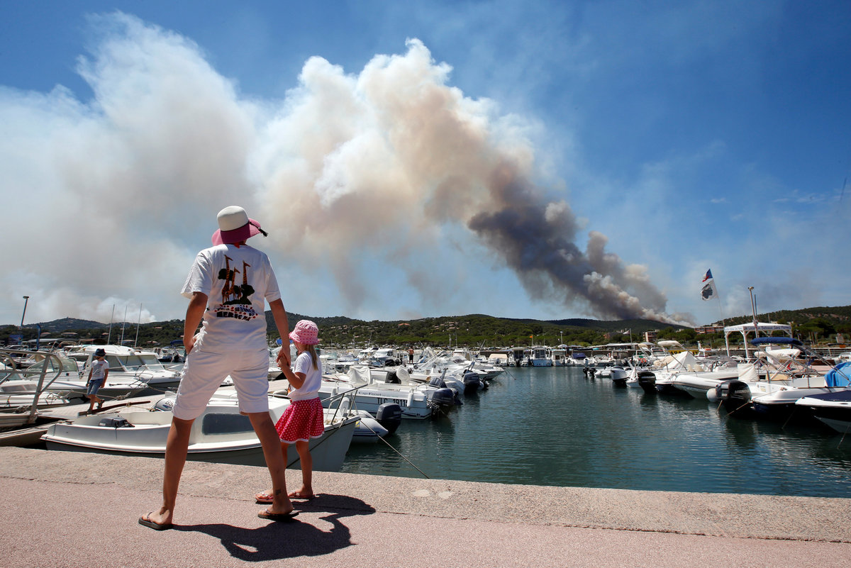 A woman and her daughter walk near leisure boats in a port as a plume of smoke from burning fires fills the sky in Bormes-les-Mimosas, in the Var department, France, July 26, 2017. REUTERS/Jean-Paul Pelissier TPX IMAGES OF THE DAY