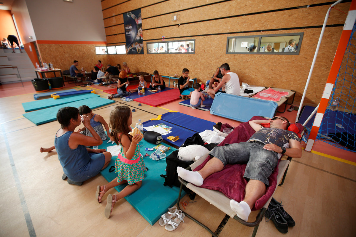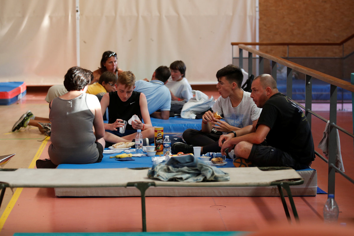 Tourists who were evacuated due to a forest fire, eat a meal and rest in a gymnasium in Bormes-les-Mimosas, in the Var department, France, July 26, 2017. REUTERS/Jean-Paul Pelissier