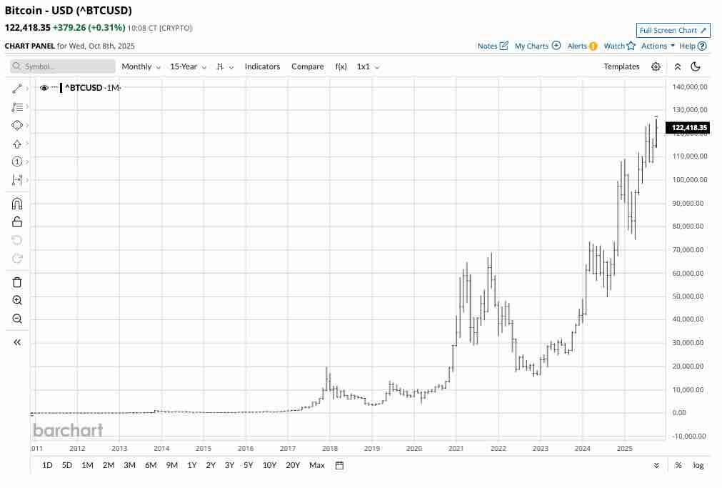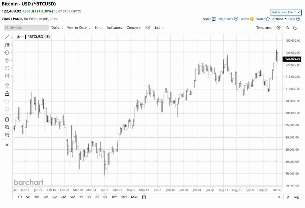 I asked how high Bitcoin can rise or fall in an August 22, 2025, Barchart article. I concluded with: