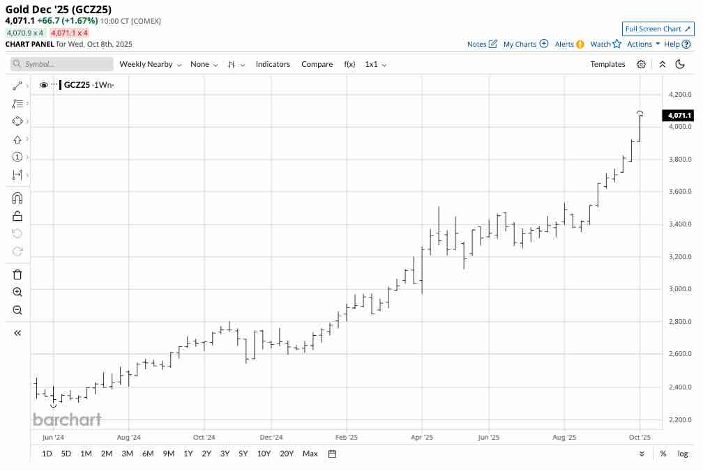 Gold, the world’s oldest commodity and means of exchange, has experienced an explosive rally. After reaching a low of $252.80 in 1999, gold is now trading over $4,000 per ounce. Gold’s rally turned parabolic in late 2023, the last time the precious metal traded below $2,000 per ounce.