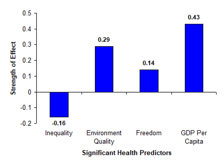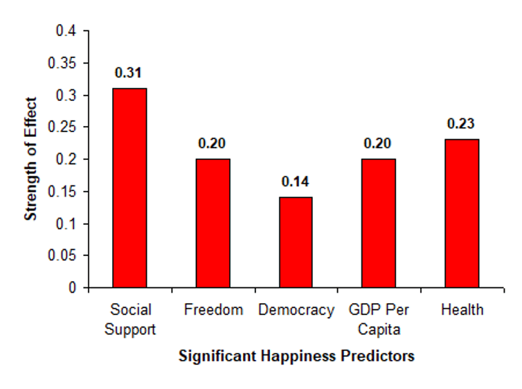 Other factors that influence happiness are also covered in the World Happiness Report. These include wealth (GDP per capita), perceptions of social support, freedom to make life choices, degree of democracy, the extent of income inequality across a country’s population, and the quality of the environment. Of these, some have a significant effect on happiness. Those that do have the relative strength of their effects shown in the graph below.