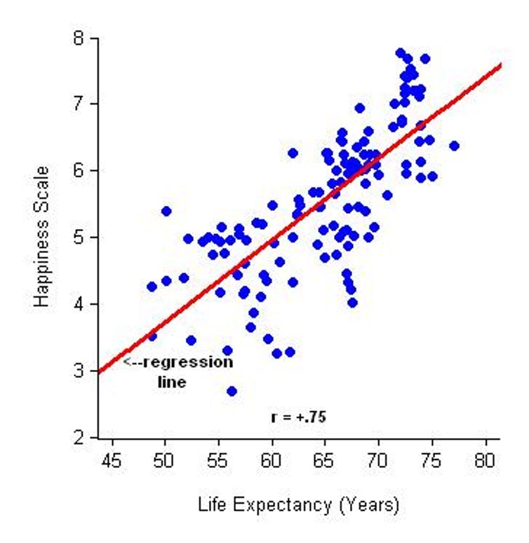 But even when we control for these other factors, the relationship between health and happiness holds up. Average self-rated happiness climbs steadily from 4.5 to 6.3 as longevity increases from 40 to 80 years – an increase of about 40 percent. Healthy states are happy states.