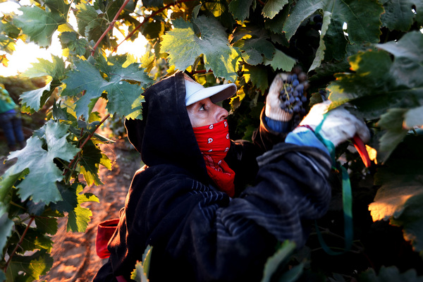 Crecencio Camacho, 45, remembers that when he was a farm laborer in his teens, farmers did not provide employees with potable water or restrooms. In more recent years, legislative changes have implemented protections for workers against heat illnesses and sought to require safety belts on farm labor vans. Today, Camacho earns $10 an hour working a grape harvester through the night and said he struggles to support his wife and three children.
