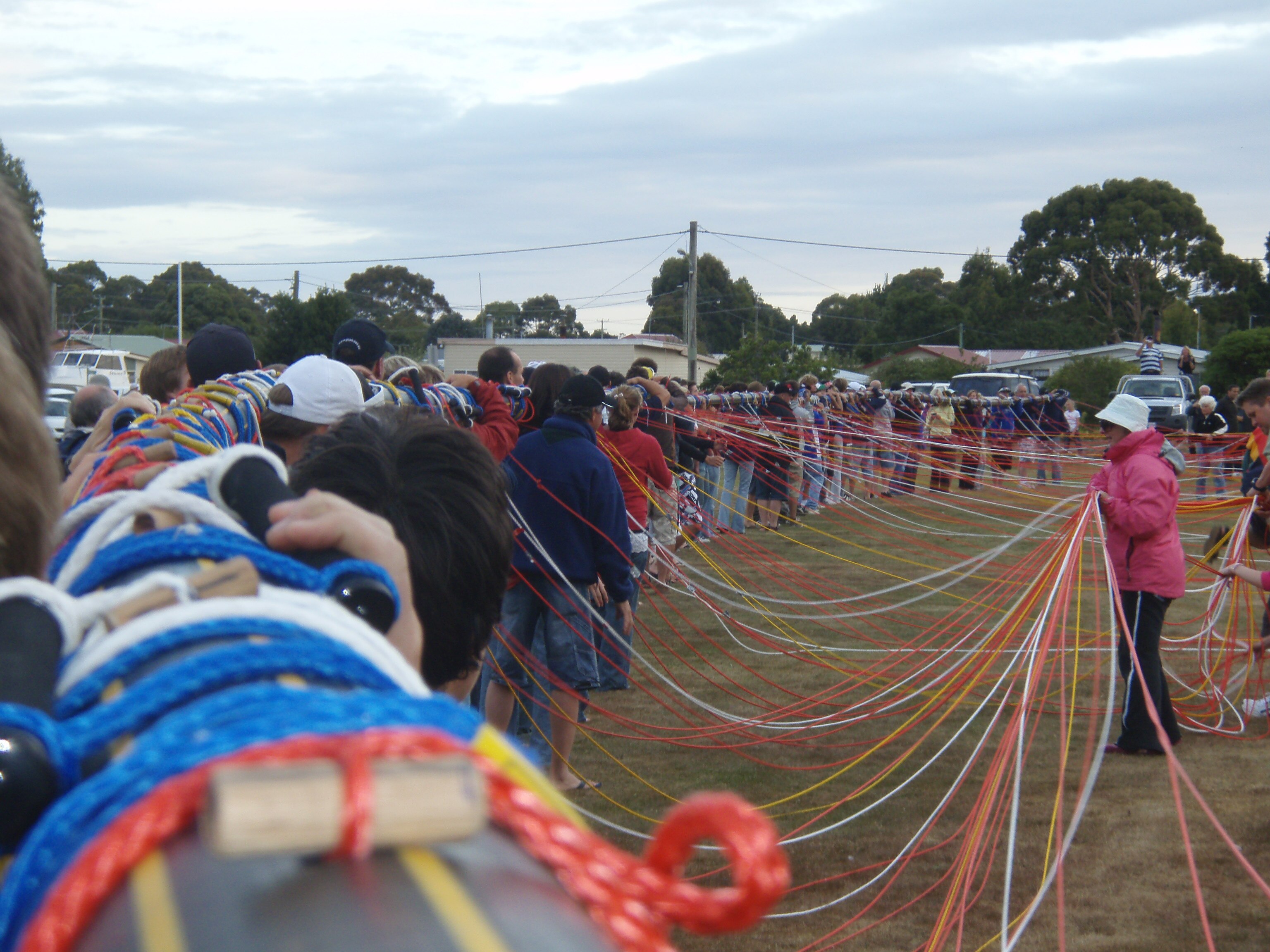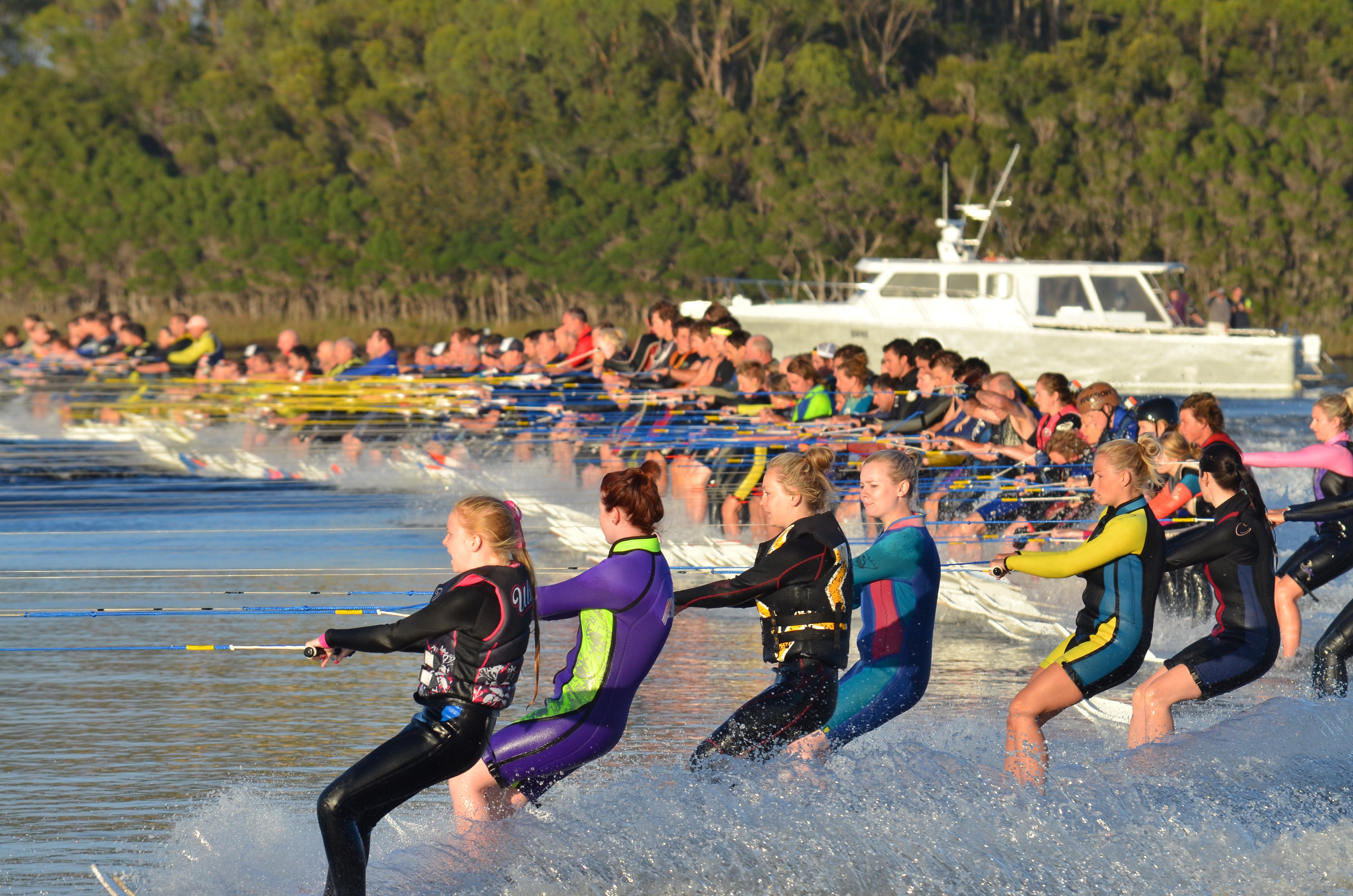 On January 27, 2012, a cruise boat pulled 145 skiers on Macquarie Harbour in Strahan for 1 nautical mile (just under 2 kilometres).