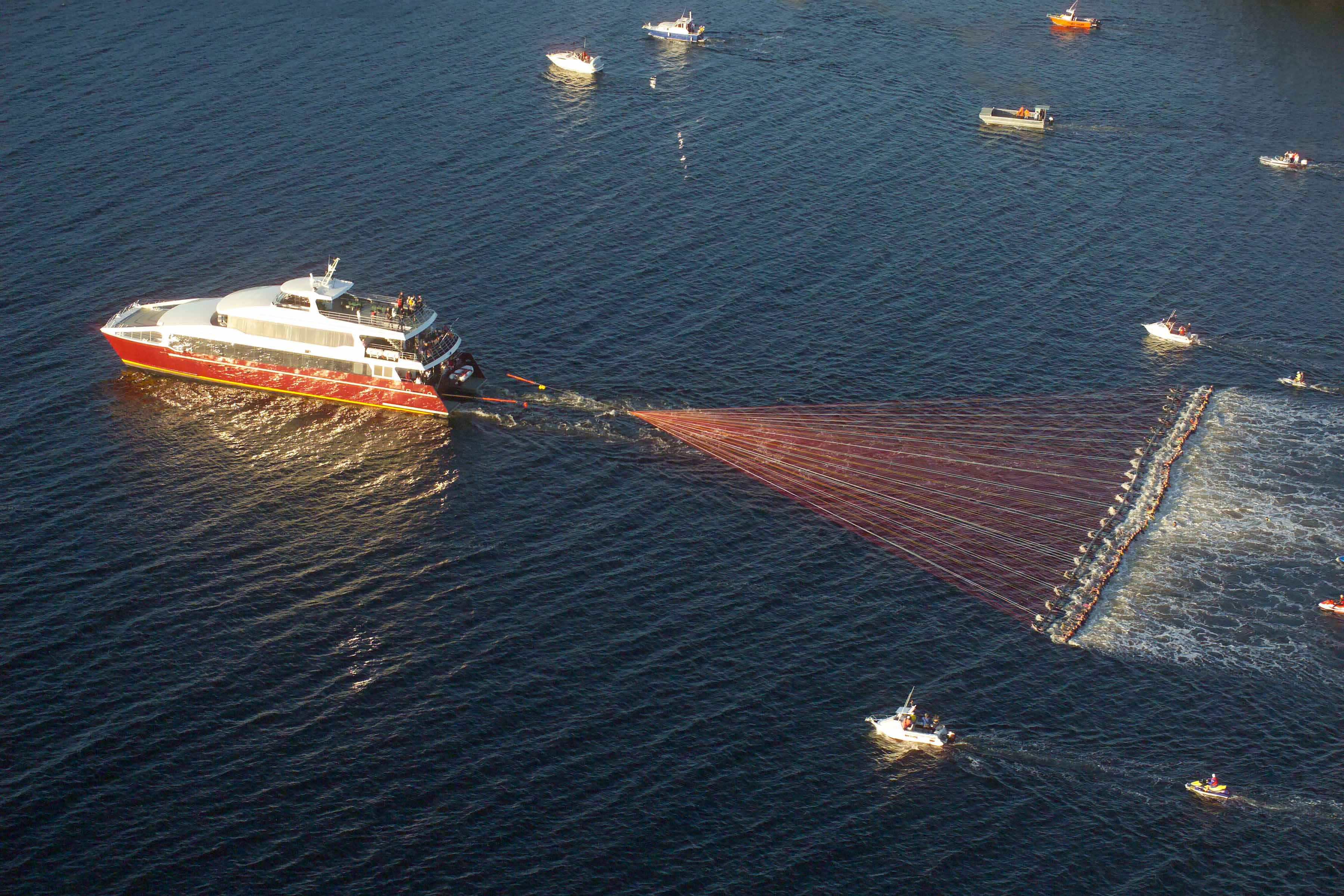 A new aluminium boom was designed, wider skis were made and 12 kilometres of rope were used to connect the skiers to the boat.