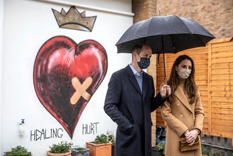 The Duke and Duchess of Cambridge have been pictured in front of street art that reads “healing hurt” as they visited an ambulance station in east London on Thursday.