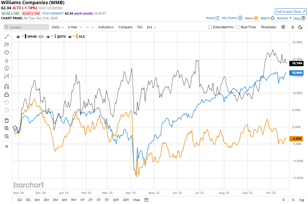 WMB stock prices have surged 19.9% over the past 52 weeks, notably outperforming the Energy Select Sector SPDR Fund’s (XLE) 3.8% dip and the S&P 500 Index’s ($SPX) 15.1% returns during the same time frame.