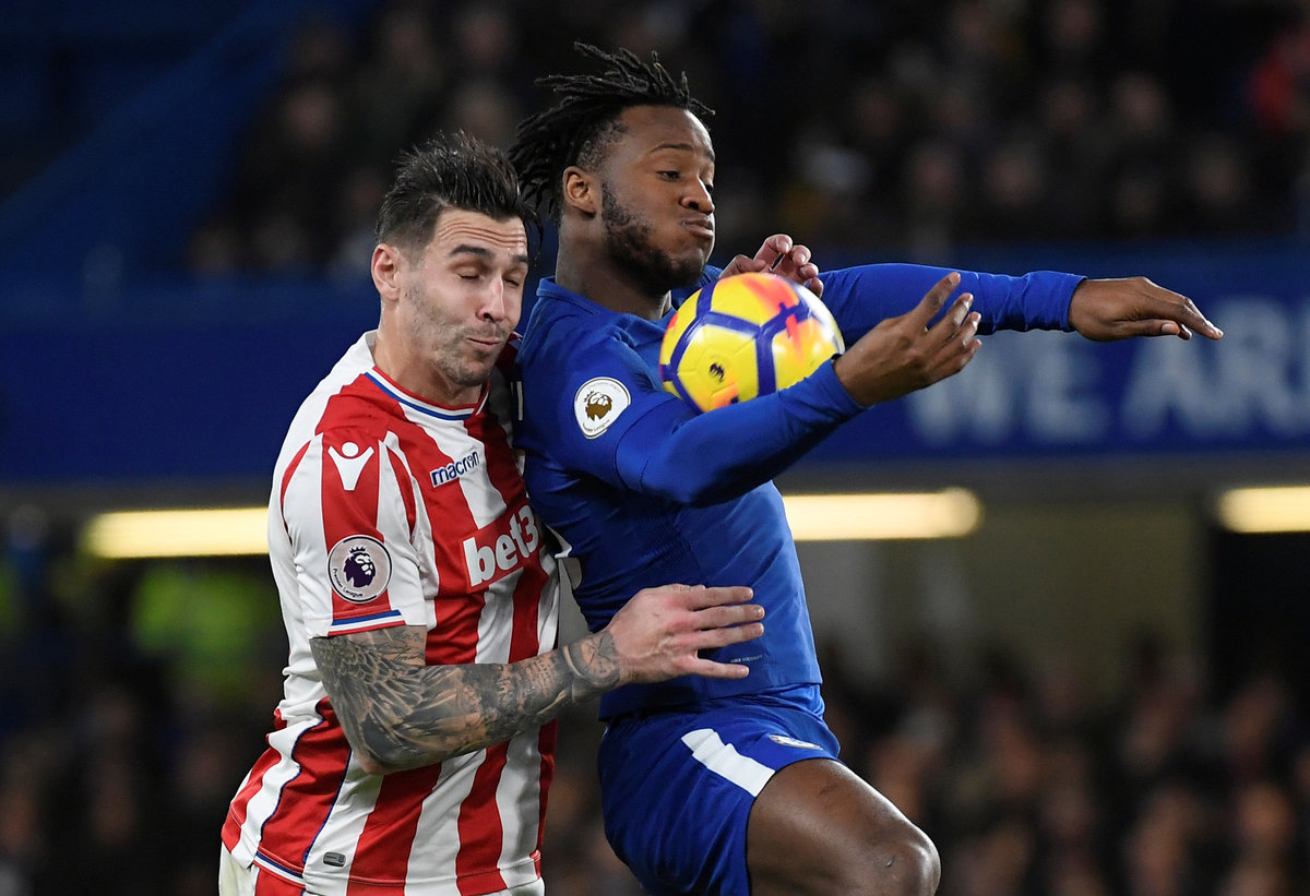 Soccer Football - Premier League - Chelsea vs Stoke City - Stamford Bridge, London, Britain - December 30, 2017 Chelsea's Michy Batshuayi in action with Stoke City's Geoff Cameron REUTERS/Toby Melville