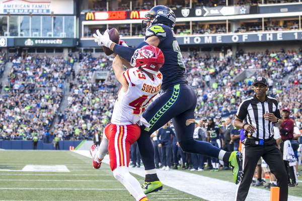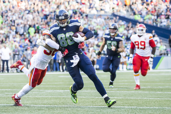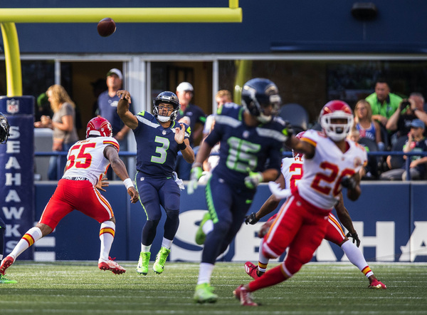 Friday night, against a Kansas City defense that led the Chiefs to a 12-4 record last season, Wilson made ready use of all his offensive weapons. He hit seven different receivers in the first half and completed passes to four different receivers for 20 yards or more in averaging a whopping 11.4 yards per attempt.