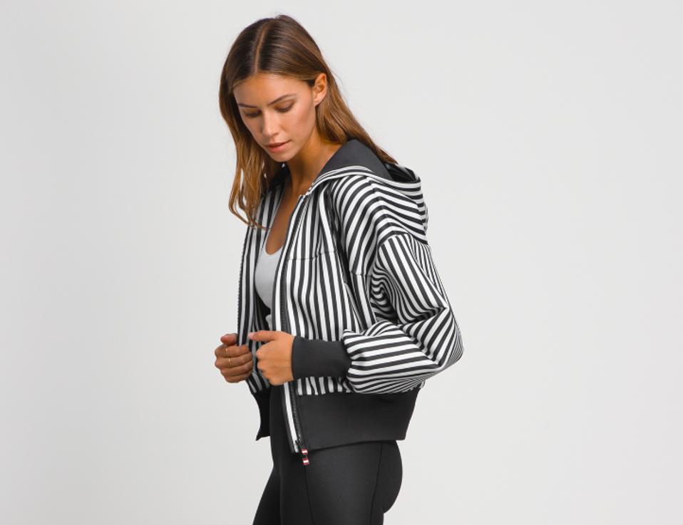 The latest release, Wilson Sportswear 008 available online Oct. 14, comes as a basketball-inspired collection, a subtle nod to Wilson returning as the official ball of the NBA. This, the second basketball-inspired collection so far, pulls inspiration from past catalogs and refreshes styles by bringing colors reminiscent of team sports. Expect to see a mix of lifestyle hoodies, jackets and fleece. At the same time, the basketball short remains a constant, with the cut-and-sew style of the original catalogs and the stripes a play off the bonded seams of the leather ball. Those same stripes appear on biker shorts and leggings.