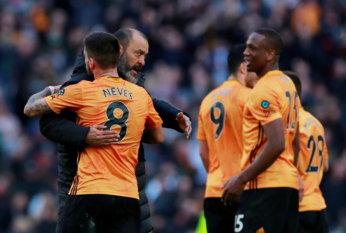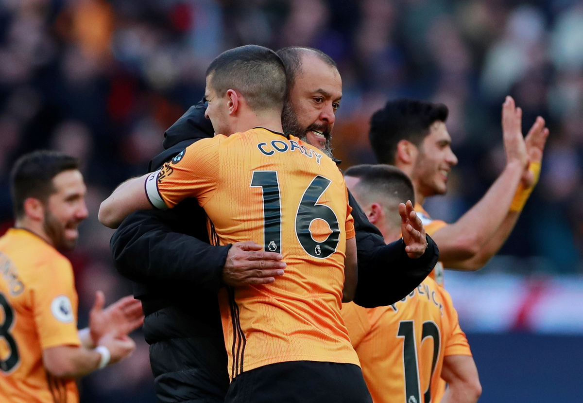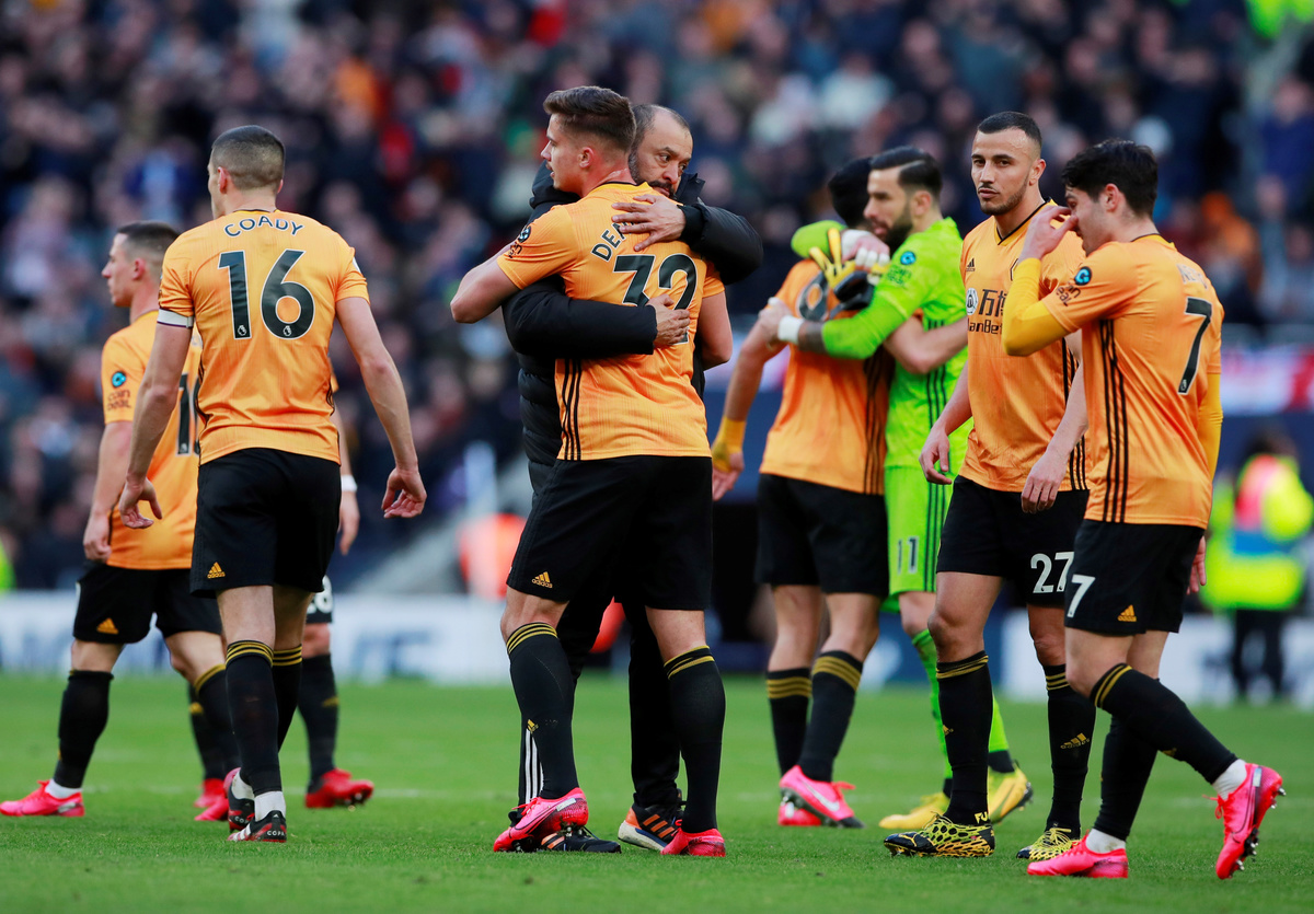 Soccer Football - Premier League - Tottenham Hotspur v Wolverhampton Wanderers - Tottenham Hotspur Stadium, London, Britain - March 1, 2020 Wolverhampton Wanderers manager Nuno Espirito Santo celebrates with Ruben Neves and teammates after the match Action Images via Reuters/Andrew Couldridge
