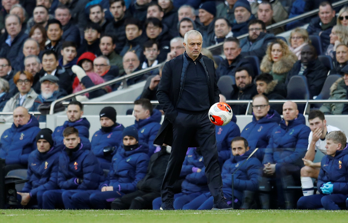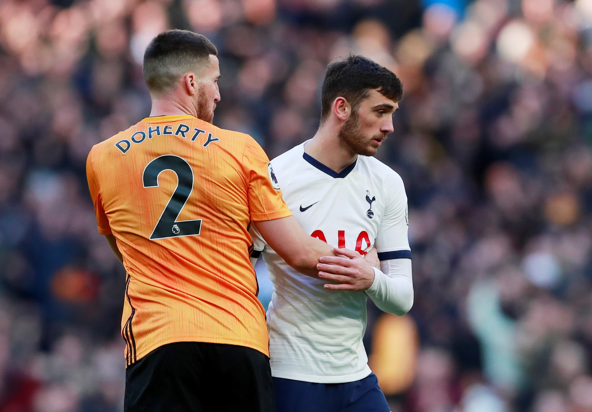 Soccer Football - Premier League - Tottenham Hotspur v Wolverhampton Wanderers - Tottenham Hotspur Stadium, London, Britain - March 1, 2020 Wolverhampton Wanderers' Matt Doherty with Tottenham Hotspur's Troy Parrott after the match Action Images via Reuters/Andrew Couldridge Soccer Football - Premier League - Tottenham Hotspur v Wolverhampton Wanderers - Tottenham Hotspur Stadium, London, Britain - March 1, 2020 Tottenham Hotspur manager Jose Mourinho reacts REUTERS/Peter Nicholls Soccer Football - Premier League - Tottenham Hotspur v Wolverhampton Wanderers - Tottenham Hotspur Stadium, London, Britain - March 1, 2020 Wolverhampton Wanderers' Daniel Podence comes on as a substitute to replace Raul Jimenez REUTERS/Peter Nicholls Soccer Football - Premier League - Tottenham Hotspur v Wolverhampton Wanderers - Tottenham Hotspur Stadium, London, Britain - March 1, 2020 Tottenham Hotspur's Dele Alli reacts Action Images via Reuters/Andrew CouldridgeSoccer Football - Premier League - Tottenham Hotspur v Wolverhampton Wanderers - Tottenham Hotspur Stadium, London, Britain - March 1, 2020 Tottenham Hotspur's Ben Davies is shown a yellow card by referee Stuart Attwell REUTERS/Peter Nicholls