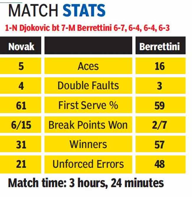 The world No. 1 quelled the challenge of the crowd favourite Matteo Berrettini to come through 6-7 (4), 6-4, 6-4, 6-3 in three hours and 24 minutes.