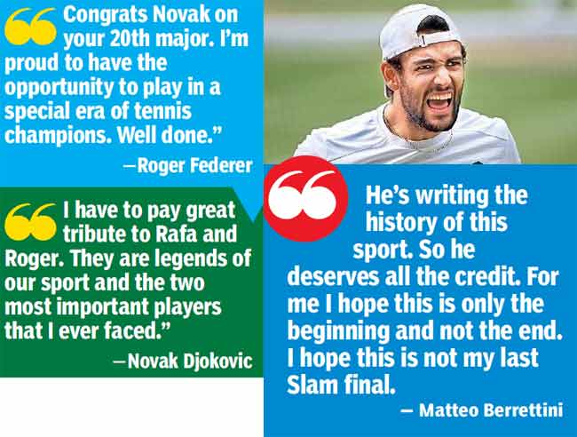 Djokovic quells spirited challenge from Berrettini to win 20th Major and sixth Wimbledon title to go level with Federer and Nadal