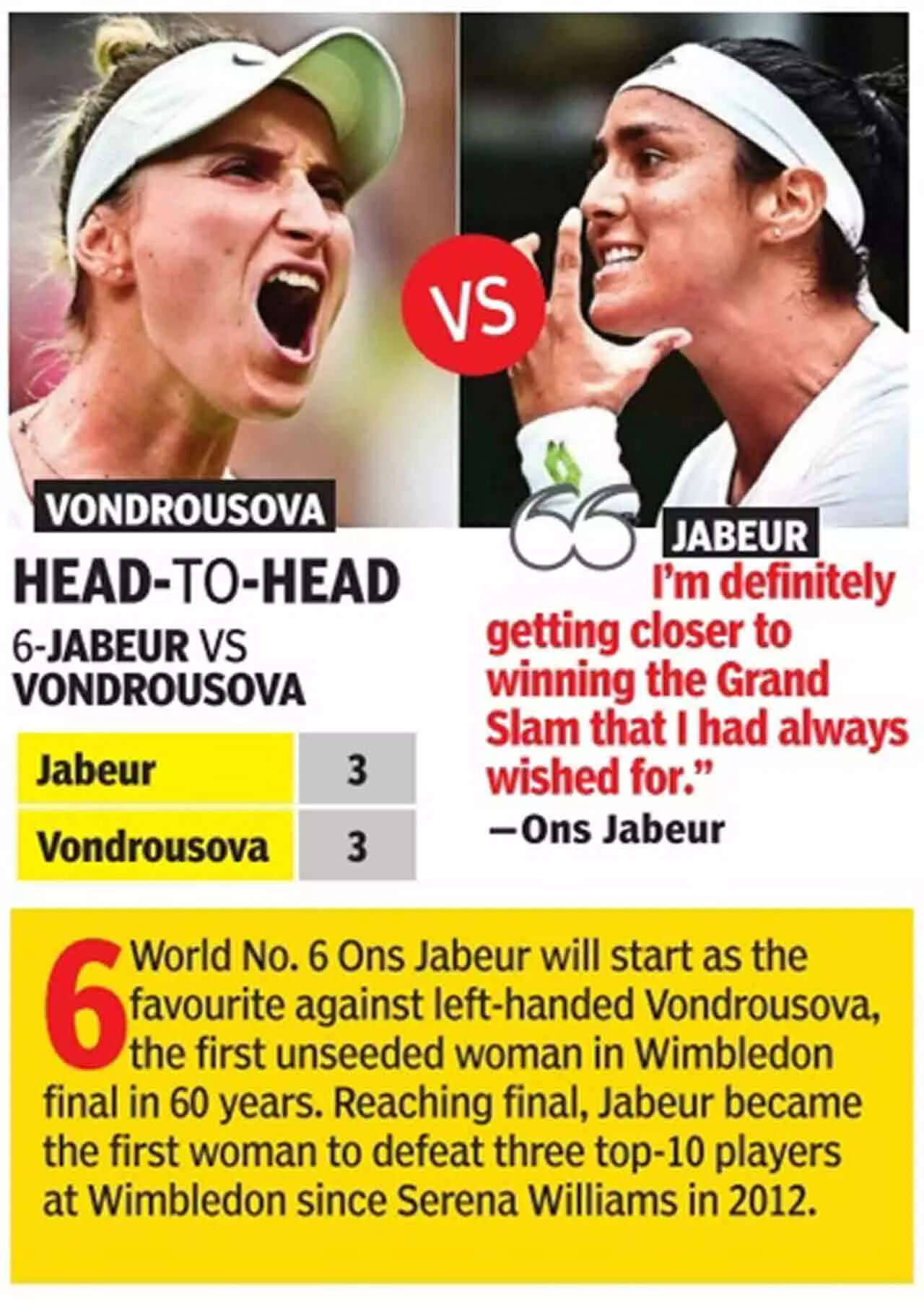 The SW19 title match is Jabeur's third major final, and Vondrousova's second.