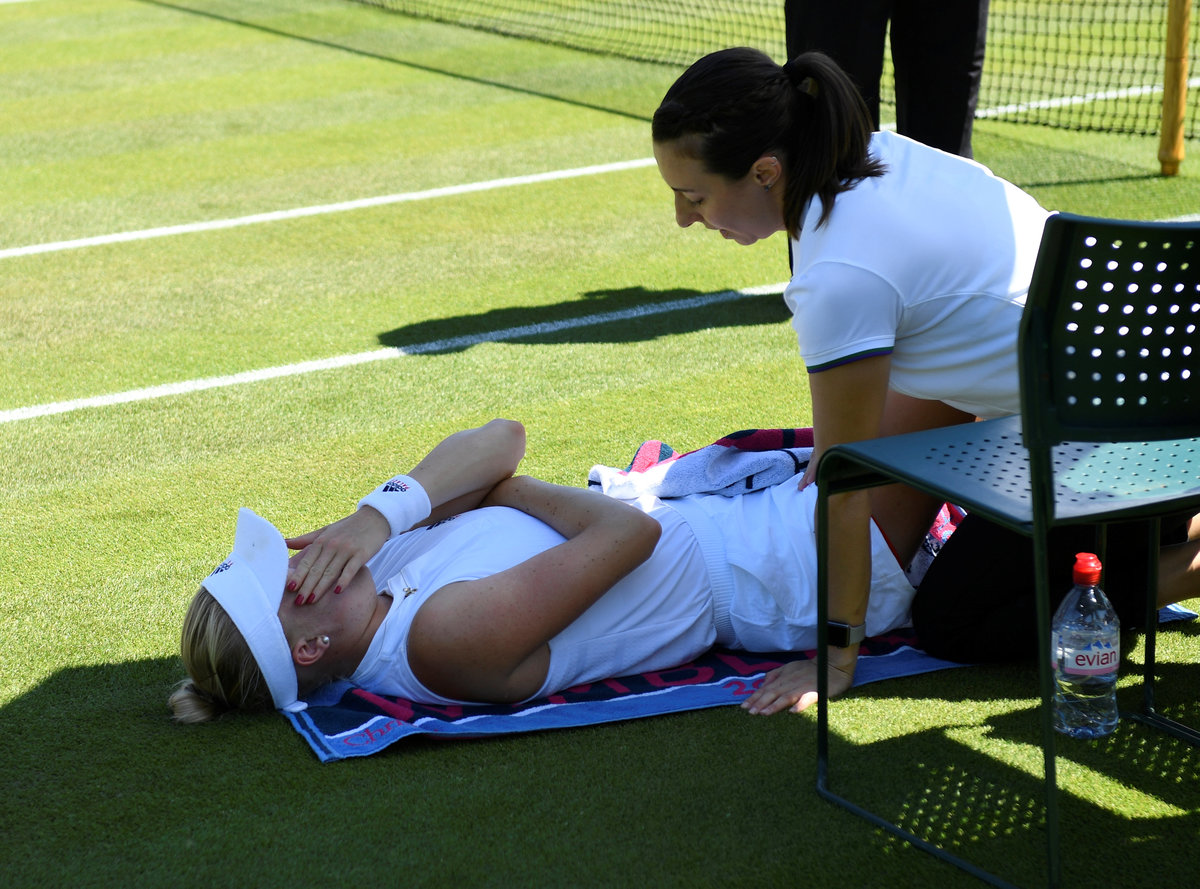 Tennis - Wimbledon - All England Lawn Tennis and Croquet Club, London, Britain - July 2, 2018 Britain's Harriet Dart receives medical attention after sustaining an injury during the first round match against Czech Republic's Karolina Pliskova REUTERS/Tony O'Brien
