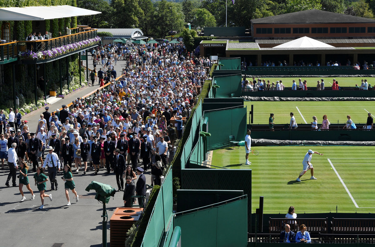 Long queues snaked around the adjacent golf course as fans waited in soaring temperatures for ground admission to a bumper programme across 17 courts.