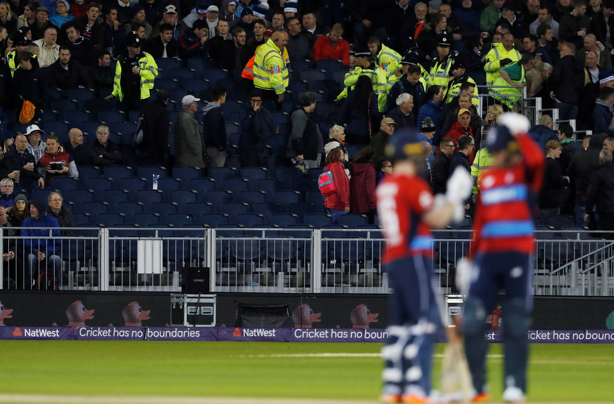 Cricket - England vs West Indies - International T20 - Emirates Riverside, Durham, Britain - September 16, 2017 Police and stewards evacuate stand during play Action Images via Reuters/Lee Smith