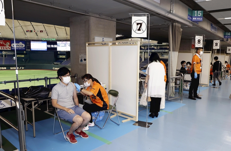 At Tokyo Dome, where mass vaccination of Tokyo residents from Bunkyo, Shinjuku and Minato wards is taking place, a big screen displays videos of Yomiuri Giants highlights to entertain the vaccinated people who have to be observed for adverse reactions in a waiting area after getting their shot. The team's cheerleaders also give away masks and drinks in an effort to ease visitors' anxiety.