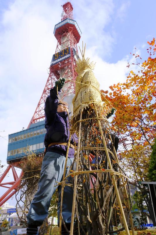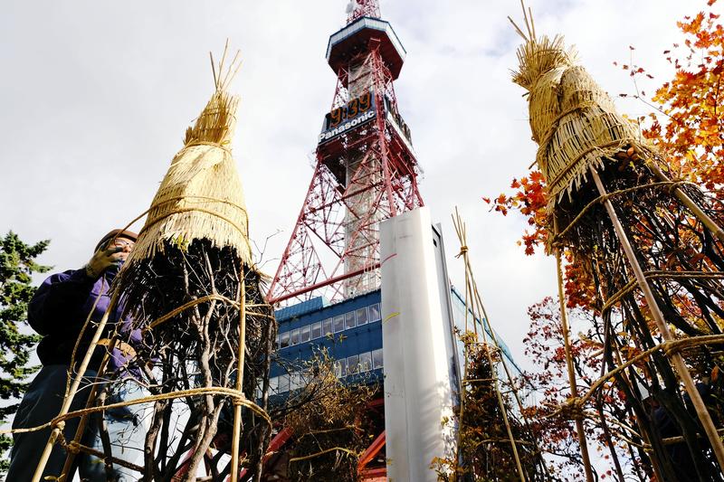 A worker covers trees with straw mats called "winter fence" at Odori Park in Chuo Ward, Sapporo, on Wednesday. The park is being considered as the start and finish for the Tokyo Olympic marathons. The winter fence heralds the arrival of winter in Sapporo. About 2,300 trees, including azaleas and yews, are being covered with mats to protect them from the snow and the cold, and branches are fixed to bamboo bars with ropes to prevent them from breaking under the weight of the snow. It will take about two weeks to complete the work.