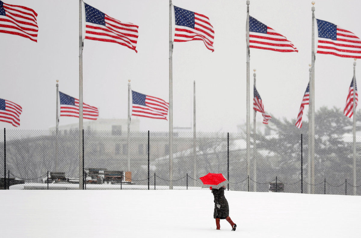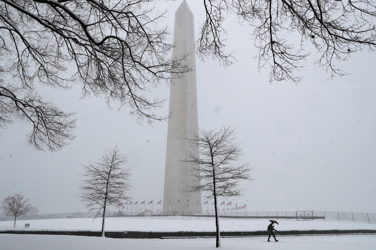 A woman holds an umbrella as she walks toward the Washington Monument during a snowstorm in Washington, U.S., March 21, 2018. REUTERS/Kevin Lamarque
