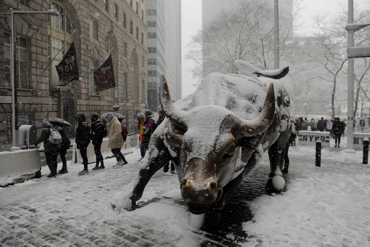 Pedestrians walk past a snow covered bull sculpture during a late season nor'easter in New York, U.S., March 21, 2018. REUTERS/Lucas Jackson