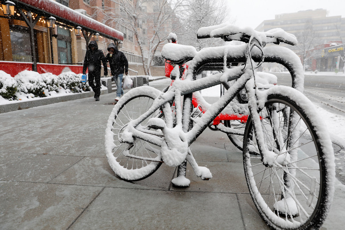 Bicycles covered by snow are seen a snowstorm in Washington, U.S., March 21, 2018. REUTERS/Yuri Gripas