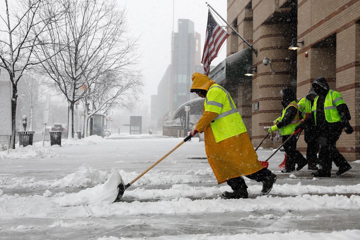 Workers clear a street during a snowstorm in Washington, U.S., March 21, 2018. REUTERS/Yuri Gripas
