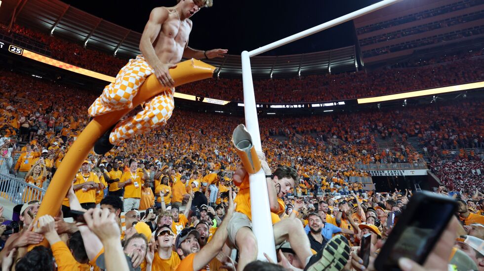 Baptizeman: Tennessee fans swim away with the honors for celebrating an incredible 52-49 win against Alabama by carrying the goal posts right out of Neyland Stadium and heaving them into the Tennessee River.