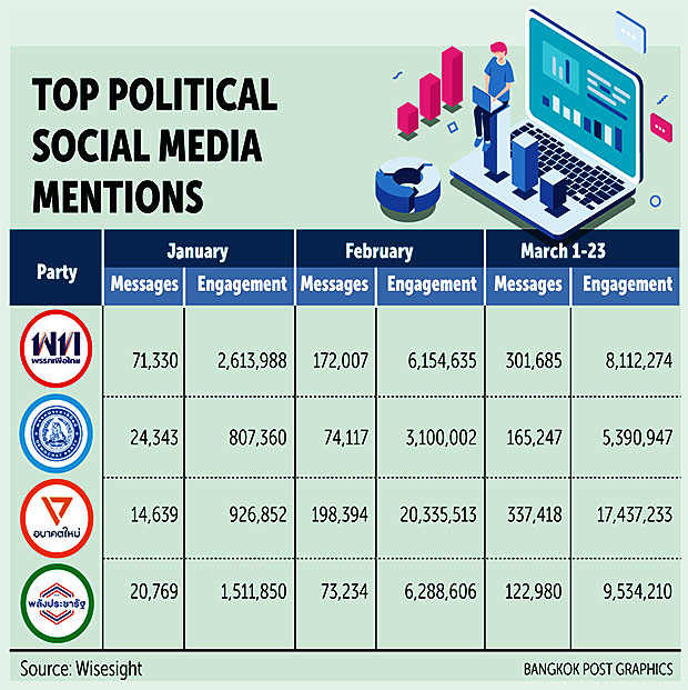 Wisesight found a total of 1,386,294 mentions in messages and 67,499,857 engagements on social media posts related to political parties and their leaders.